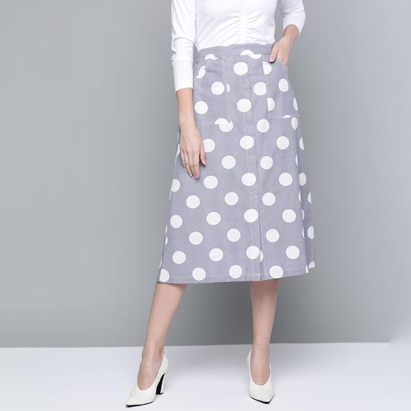 Grey & white polka dot print midi A-line skirt with front slit, has partially elasticated waistband with slip-on closure, 2 oversized insert pockets and straight hem